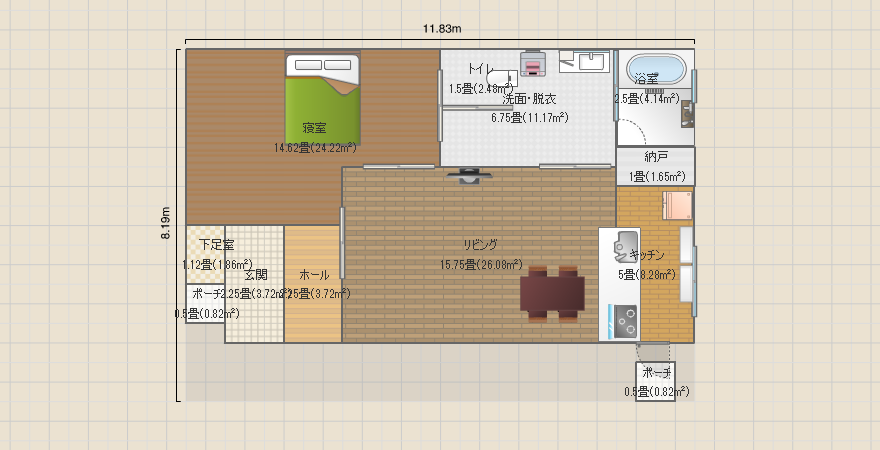 中庭5.2畳の平屋2LDK(19畳)(T1)12.7x8.6 R3-LC