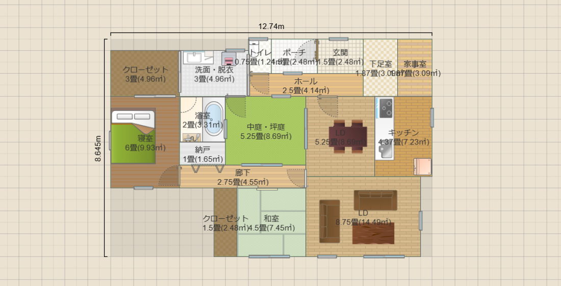 中庭5.2畳の平屋2LDK(19畳)(T1)12.7x8.6 R3-LC