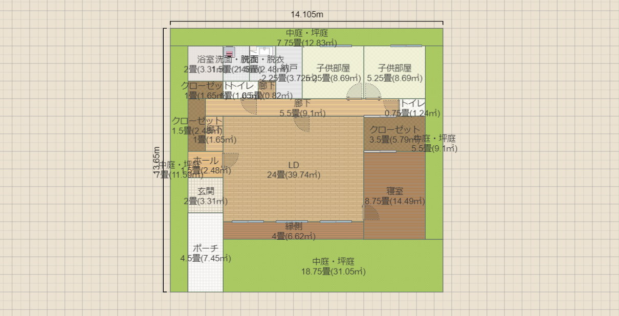 癒しの平屋中庭8.3畳 Ⅱ型キッチン想定 2LDK(21畳)+1 12.3x10.9 R5