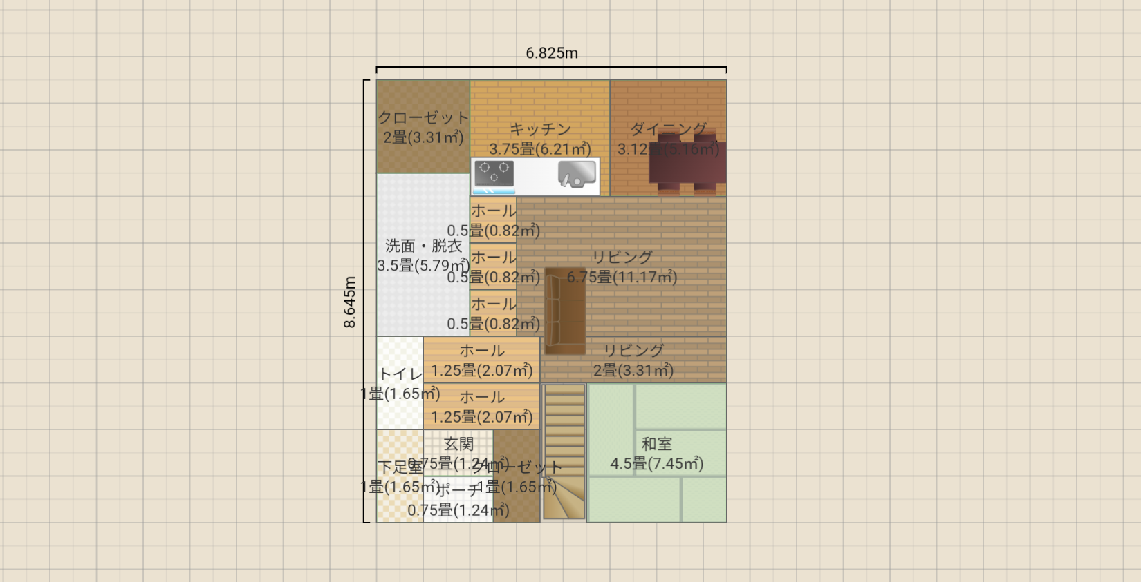 2F吹き抜け/風呂/寝室 1F低いキッチン高い和室