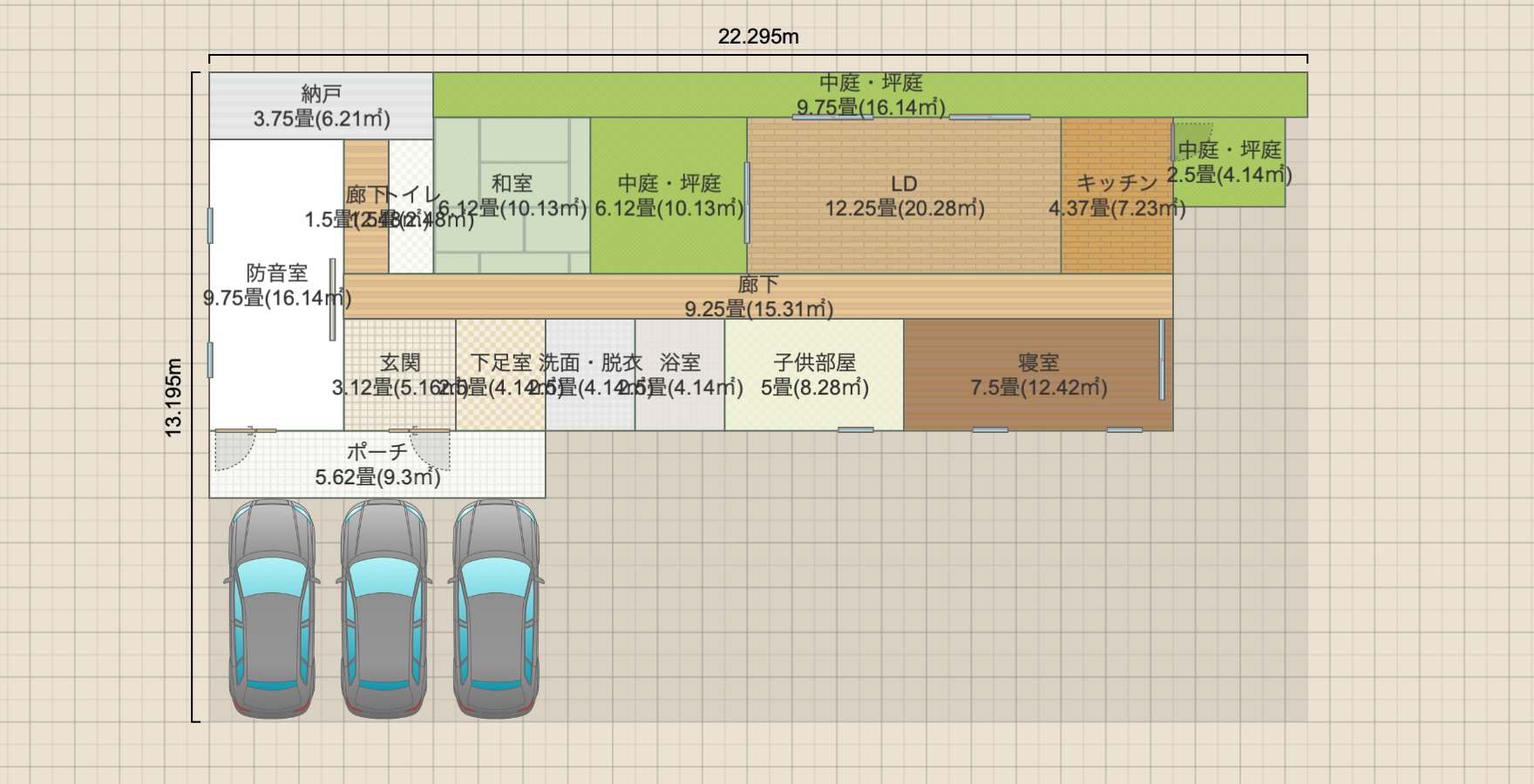 3LDK、土地60坪、インナーガレージ、2台駐車、書斎、吹抜、2階水回り、北入り