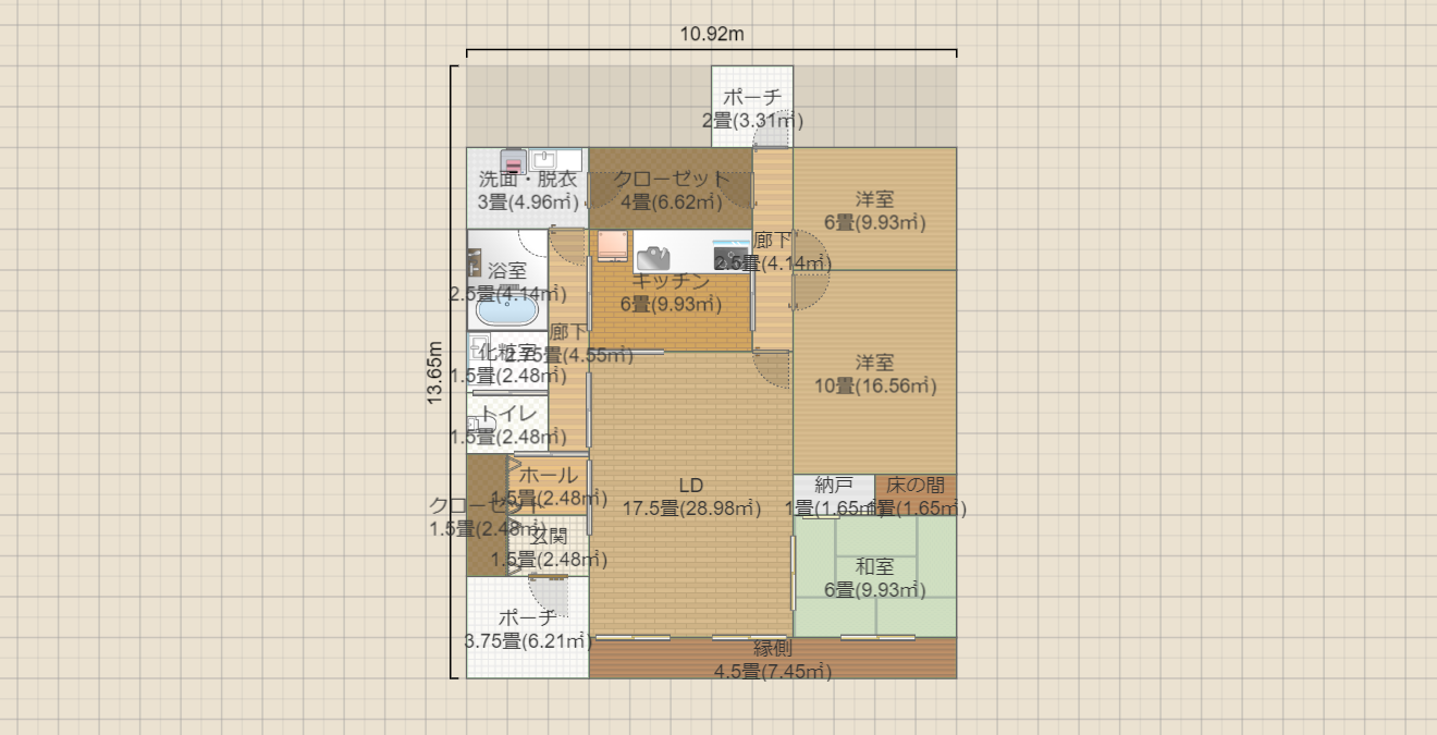 平屋。玄関クローゼット+土間収納、広い書斎、広々LDK、ウッドデッキ